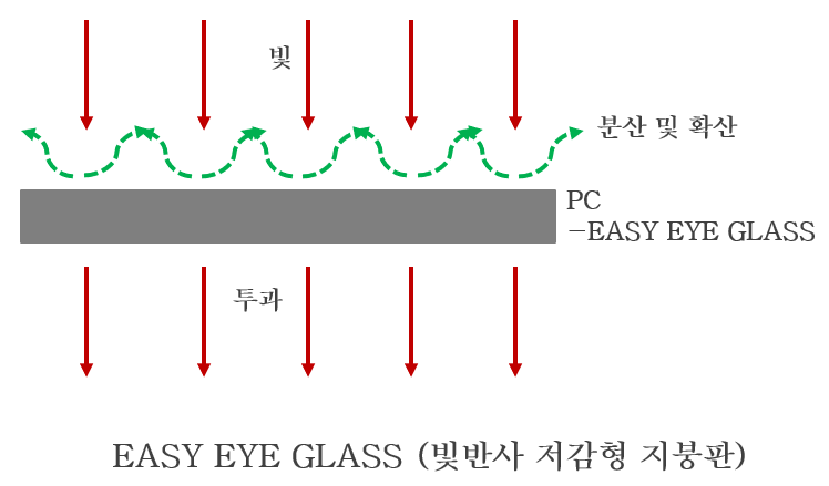 | 빛반사(광택도) | 대부분반사(100GU이상) | 30GU이하 (대부분 굴절되어 빛반사 저감효과 우수) |